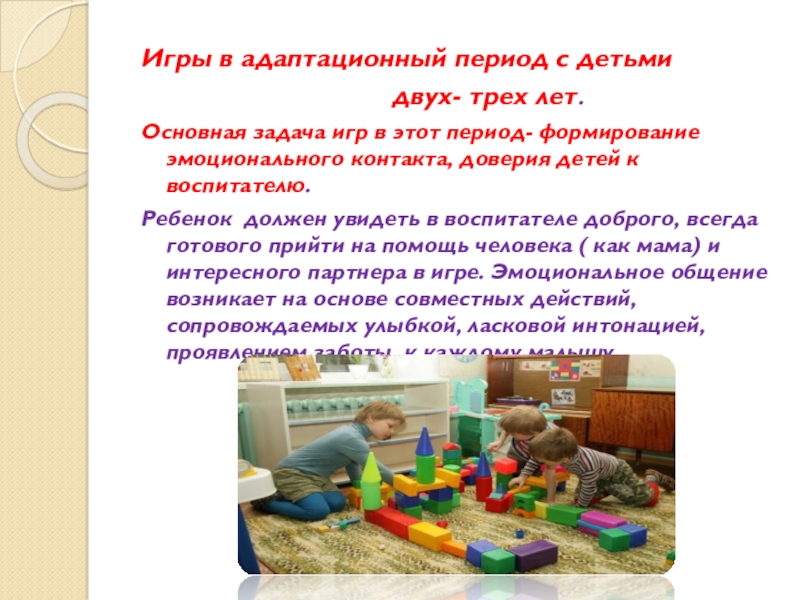 Основная задача игр в этот период- формирование эмоционального контакта, доверия детей к воспитателю.