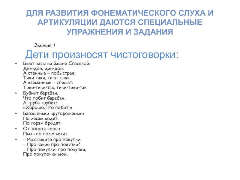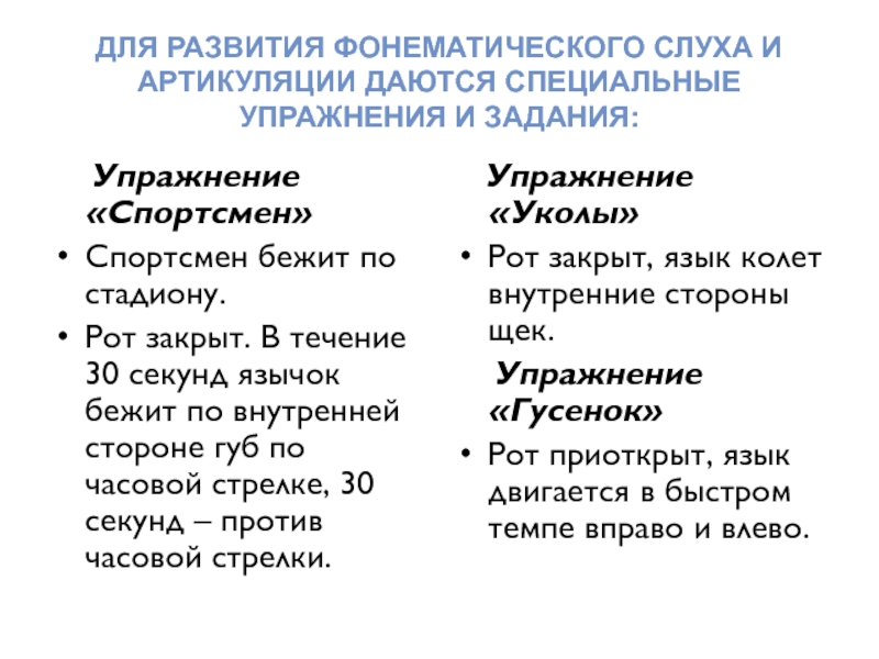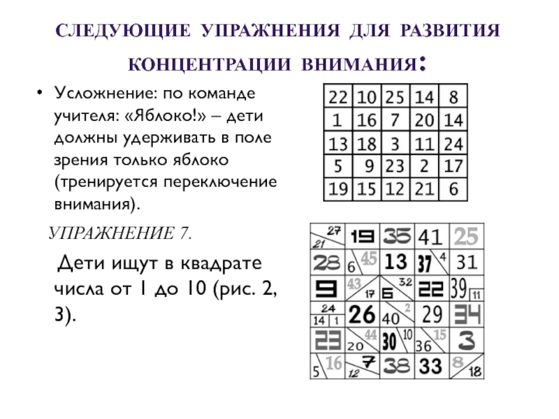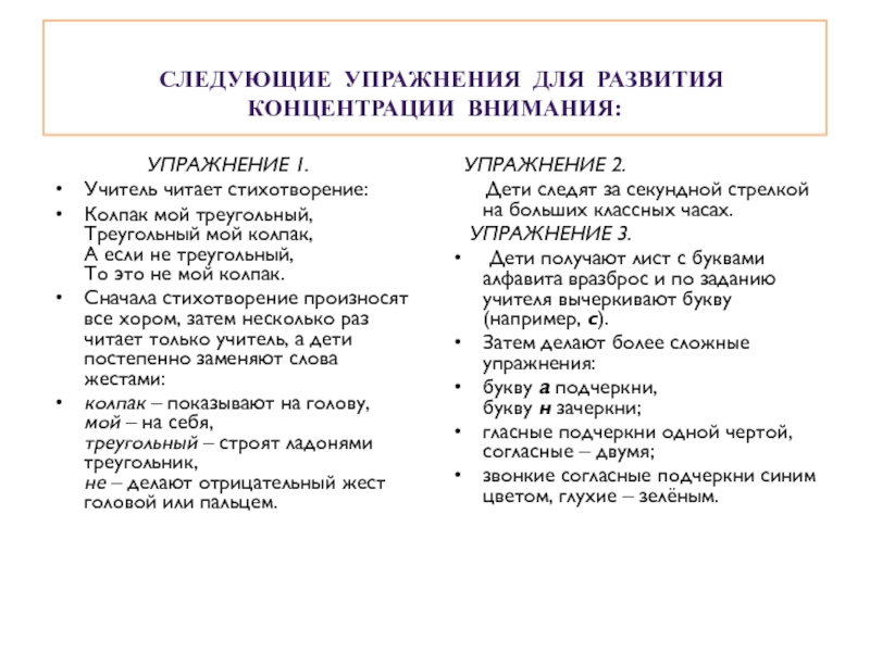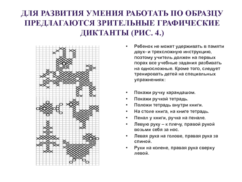 Ребенок не может удерживать в памяти двух- и трехсложную инструкцию, поэтому учитель должен на первых порах все учебные задания разбивать на односложные. Кроме того, следует тренировать детей на специальных упражнениях: