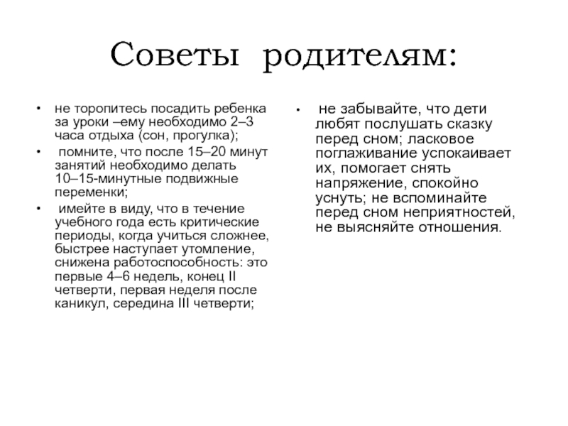 не забывайте, что дети любят послушать сказку перед сном; ласковое поглаживание успокаивает их, помогает снять напряжение, спокойно уснуть; не вспоминайте перед сном неприятностей, не выясняйте отношения.