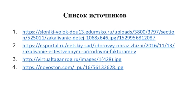 Список источниковhttps://sloniki-volok-dou13.edumsko.ru/uploads/3800/3797/section/525011/zakalivanie-detej-1068x646.jpg?1529956812087https://nsportal.ru/detskiy-sad/zdorovyy-obraz-zhizni/2016/11/13/zakalivanie-estestvennymi-prirodnymi-faktorami-vhttp://virtualtaganrog.ru/images/1(428).jpghttps://novoston.com/_pu/16/56132628.jpg