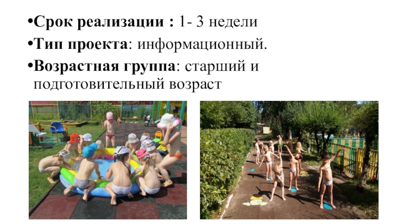 Срок реализации : 1- 3 неделиТип проекта: информационный.Возрастная группа: старший и подготовительный возраст