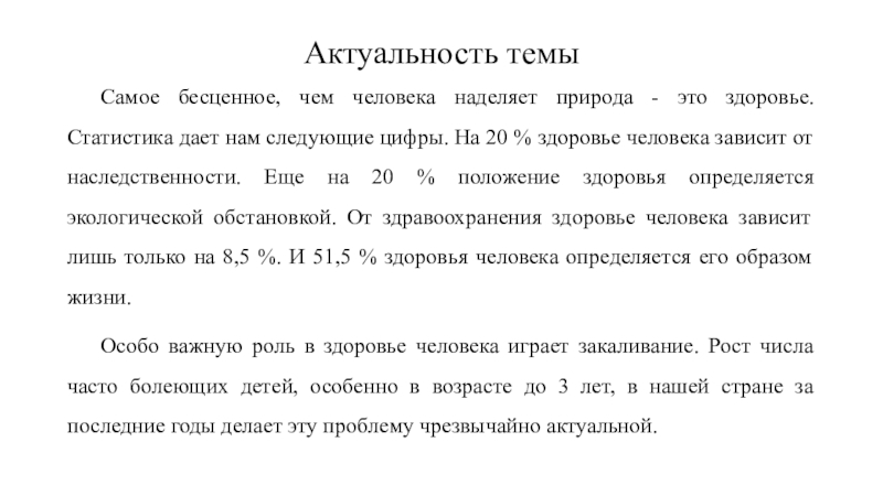 Актуальность темыСамое бесценное, чем человека наделяет природа - это здоровье. Статистика дает нам следующие цифры. На 20