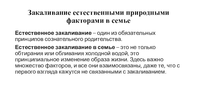 Естественное закаливание в семье – это не только обтирания или обливания холодной водой, это принципиальное изменение образа жизни. Здесь важно множество факторов, и все они взаимосвязаны, даже те, что с первого взгляда кажутся не связанными с закаливанием.