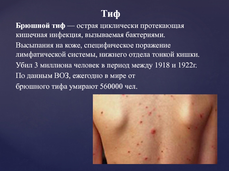 ТифБрюшной тиф — острая циклически протекающая кишечная инфекция, вызываемая бактериями. Высыпания на коже, специфическое поражение лимфатической системы, нижнего