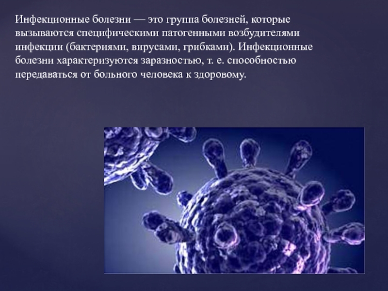 Слайд 2Инфекционные болезни — это группа болезней, которые вызываются специфическими патогенными возбудителями инфекции
