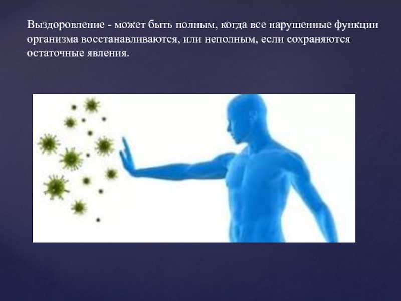 Слайд 6Выздоровление - может быть полным, когда все нарушенные функции организма восстанавливаются,
