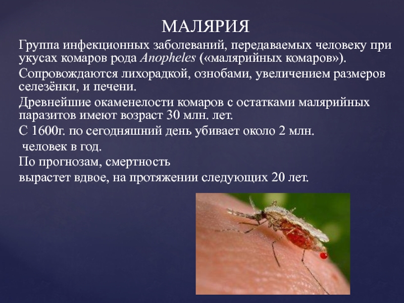 МАЛЯРИЯГруппа инфекционных заболеваний, передаваемых человеку при укусах комаров рода Anopheles («малярийных комаров»). Сопровождаются лихорадкой, ознобами, увеличением размеров