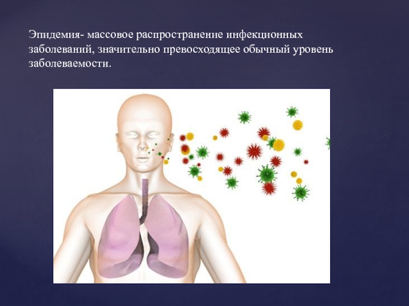 Слайд 4Эпидемия- массовое распространение инфекционных заболеваний, значительно превосходящее обычный уровень заболеваемости.