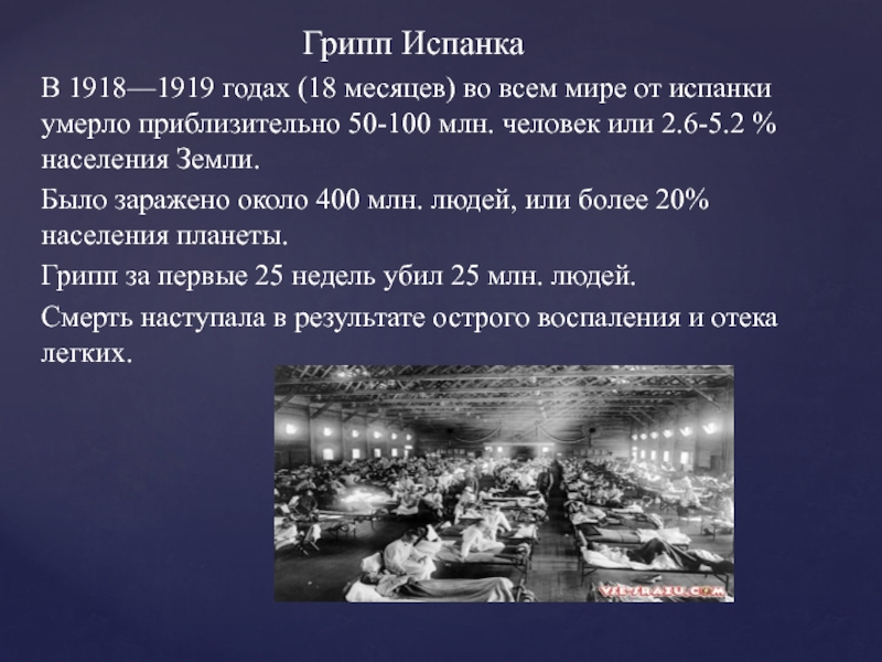 Грипп Испанка В 1918—1919 годах (18 месяцев) во всем мире от испанки умерло приблизительно 50-100 млн. человек