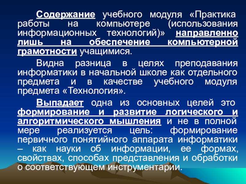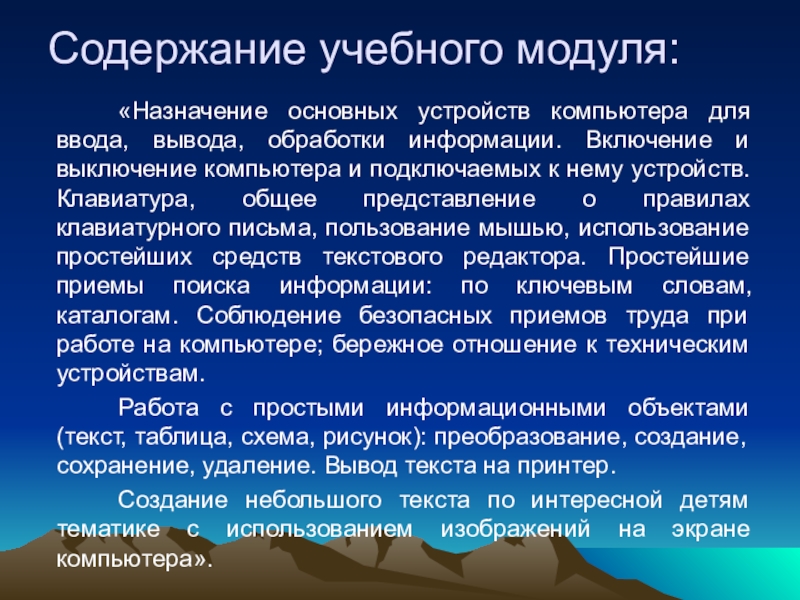 Слайд 13Содержание учебного модуля «Практика работы на компьютере (использования информационных технологий)» направленно