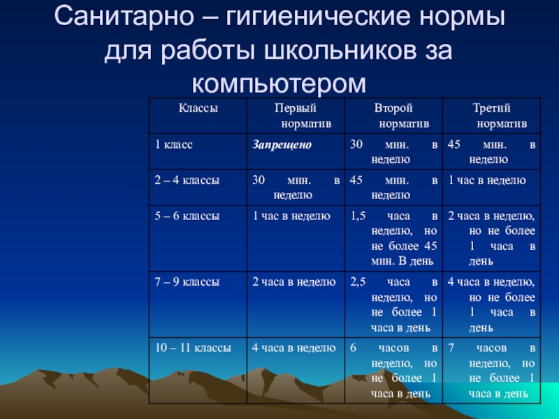 Слайд 36Санитарно – гигиенические нормы для работы школьников за компьютером