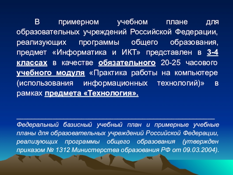 _______________________________________________________Федеральный базисный учебный план и примерные учебные планы для образовательных учреждений Российской Федерации, реализующих программы общего образования (утвержден приказом № 1312 Министерства образования РФ от 09.03.2004).