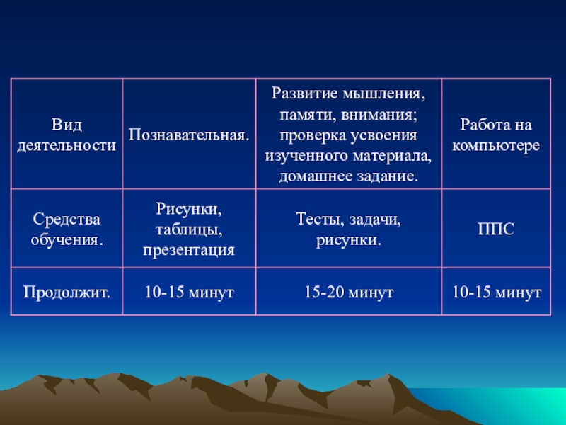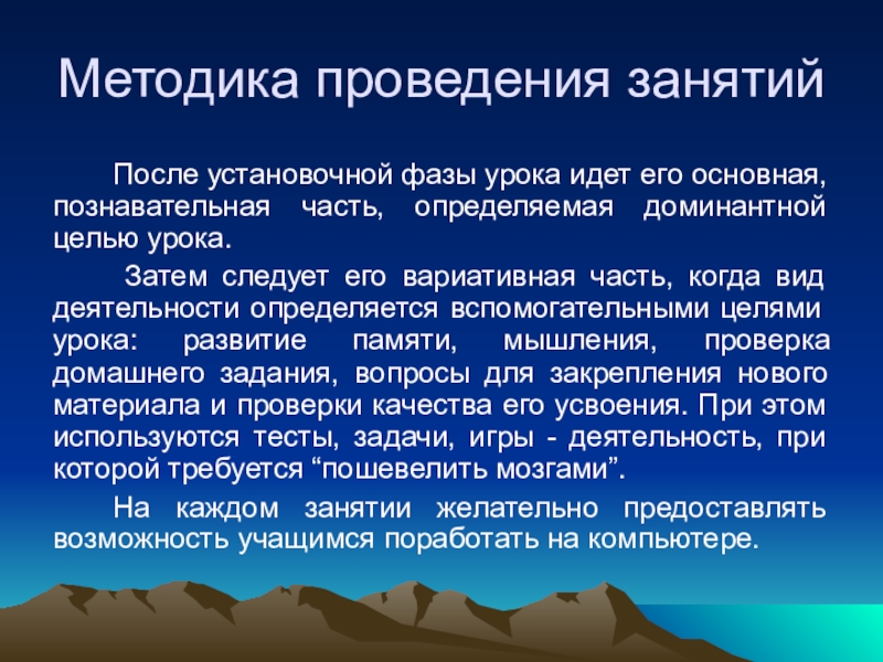 Затем следует его вариативная часть, когда вид деятельности определяется вспомогательными целями урока: развитие памяти, мышления, проверка домашнего задания, вопросы для закрепления нового материала и проверки качества его усвоения. При этом используются тесты, задачи, игры - деятельность, при которой требуется “пошевелить мозгами”.