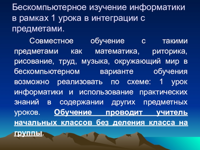 обучение с такими предметами как математика, риторика, рисование, труд, музыка, окружающий мир в бескомпьютерном варианте обучения возможно реализовать по схеме: 1 урок информатики и использование практических знаний в содержании других предметных уроков. Обучение проводит учитель начальных классов без деления класса на группы.