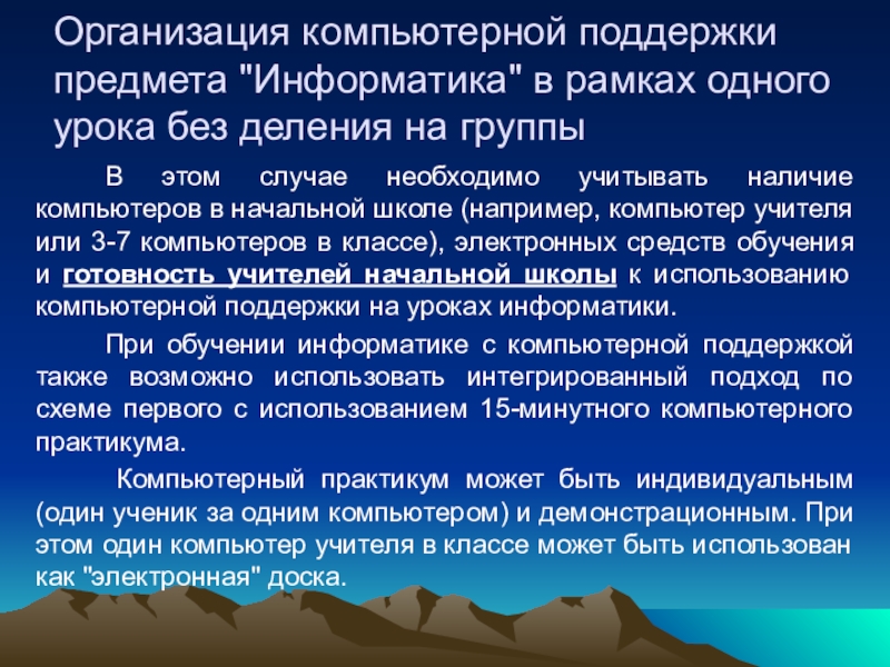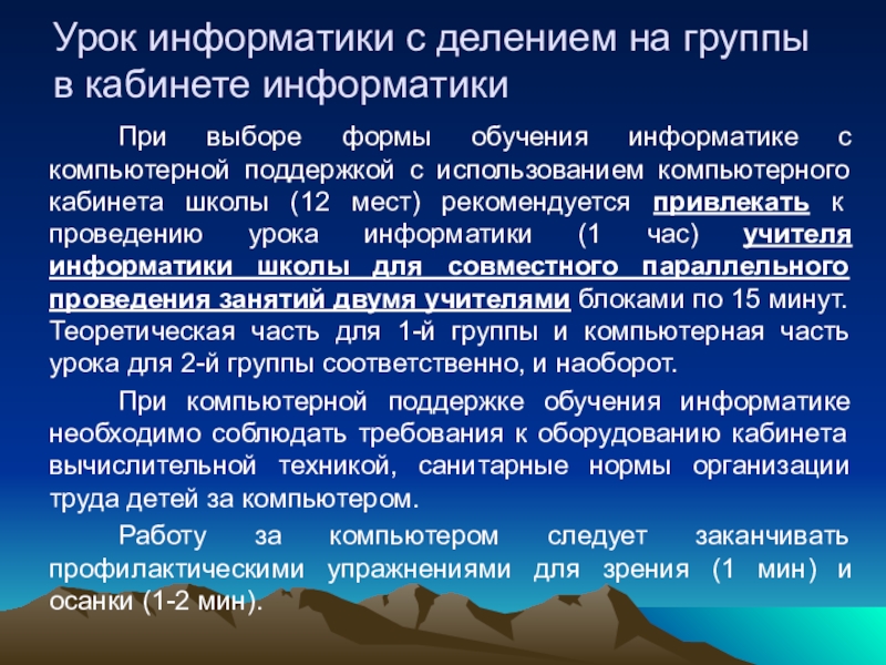 обучения информатике с компьютерной поддержкой с использованием компьютерного кабинета школы (12 мест) рекомендуется привлекать к проведению урока информатики (1 час) учителя информатики школы для совместного параллельного проведения занятий двумя учителями блоками по 15 минут. Теоретическая часть для 1-й группы и компьютерная часть урока для 2-й группы соответственно, и наоборот.