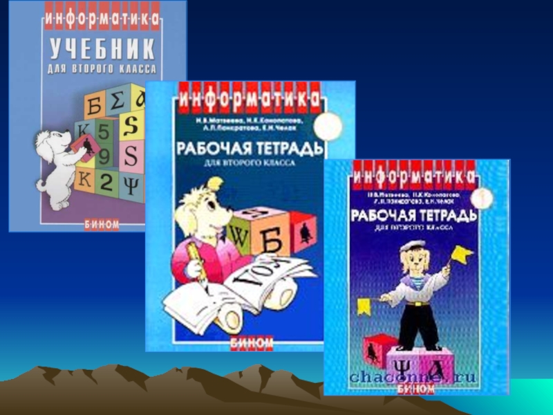 Матвеева Н.В. и др. Информатика. Рабочая тетрадь для 2 (3, 4) кл. в 2-х частях, 2-е изд. - М.: Изд-во «Бином. Лаборатория знаний», 2004-2005;