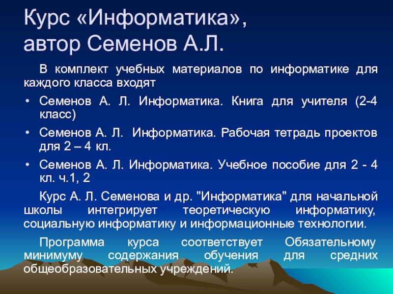 Курс А. Л. Семенова и др. "Информатика" для начальной школы интегрирует теоретическую информатику, социальную информатику и информационные технологии.