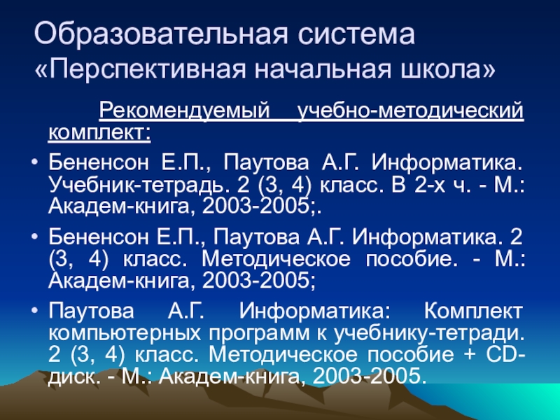 Бененсон Е.П., Паутова А.Г. Информатика. 2 (3, 4) класс. Методическое пособие. - М.: Академ-книга, 2003-2005;