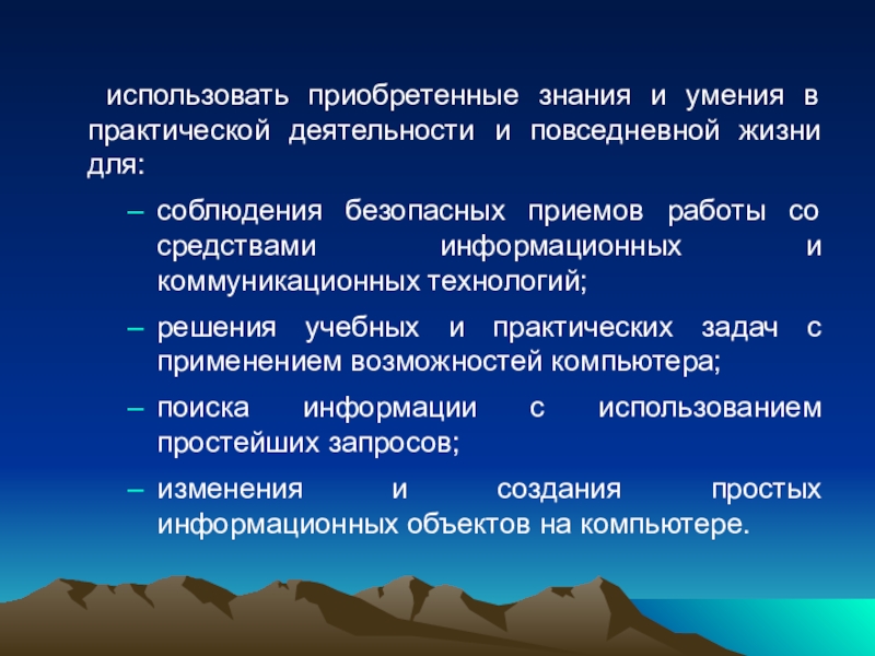 Слайд 11 использовать приобретенные знания и умения в практической деятельности и