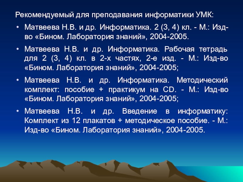 Матвеева Н.В. и др. Информатика. Методический комплект: пособие + практикум на CD. - М.: Изд-во «Бином. Лаборатория знаний», 2004-2005;
