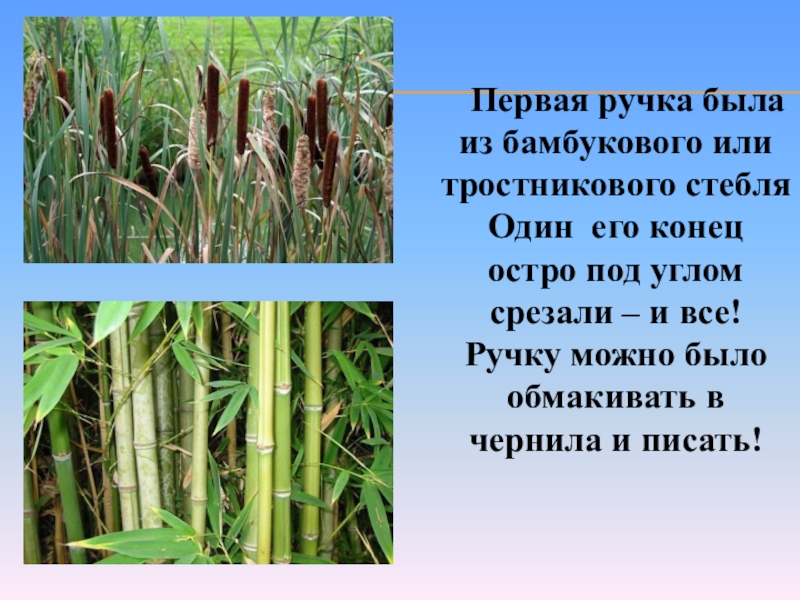 Слайд 7 Первая ручка была из бамбукового или тростникового стебля Один
