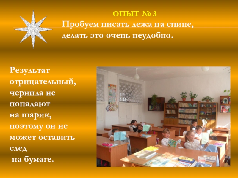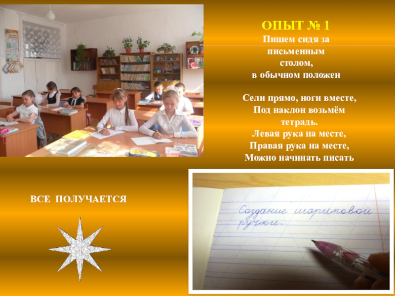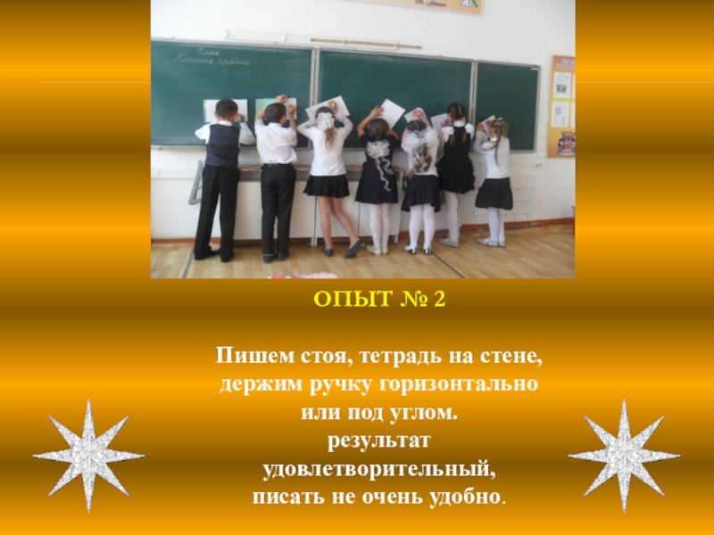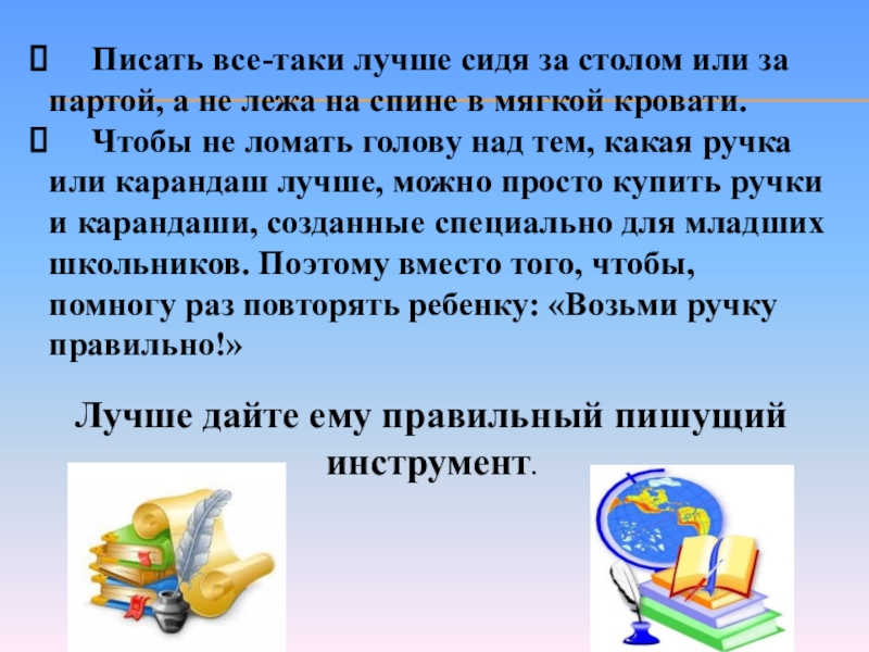 Слайд 18 Писать все-таки лучше сидя за столом или за партой, а не