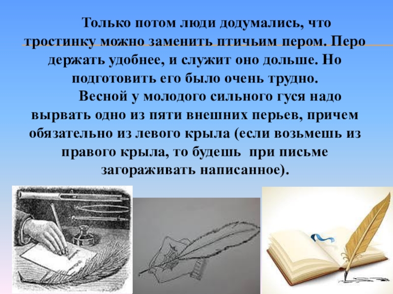 Весной у молодого сильного гуся надо вырвать одно из пяти внешних перьев, причем обязательно из левого крыла (если возьмешь из правого крыла, то будешь при письме загораживать написанное).