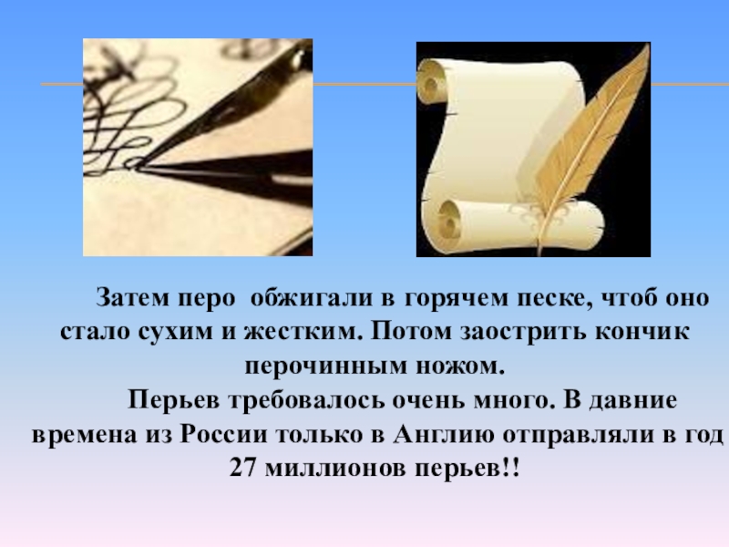 Слайд 9 Затем перо обжигали в горячем песке, чтоб