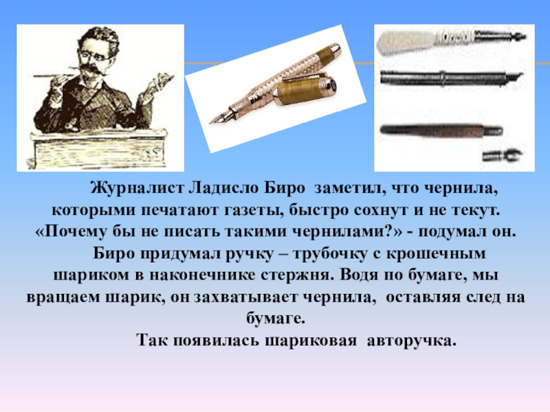 Слайд 12 Журналист Ладисло Биро заметил, что чернила, которыми