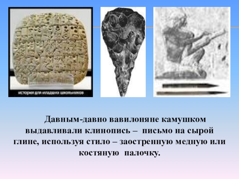 Слайд 4 Давным-давно вавилоняне камушком выдавливали клинопись – письмо на