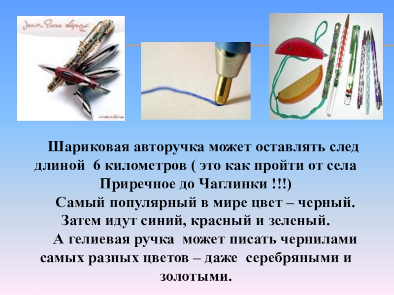 Слайд 13 Шариковая авторучка может оставлять след длиной 6 километров (