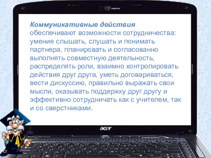 Слайд 10Коммуникативные действия обеспечивают возможности сотрудничества: умение слышать, слушать и понимать партнера,
