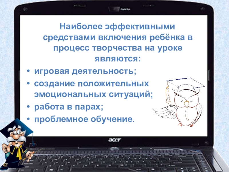 Слайд 13 Наиболее эффективными средствами включения ребёнка в процесс творчества на