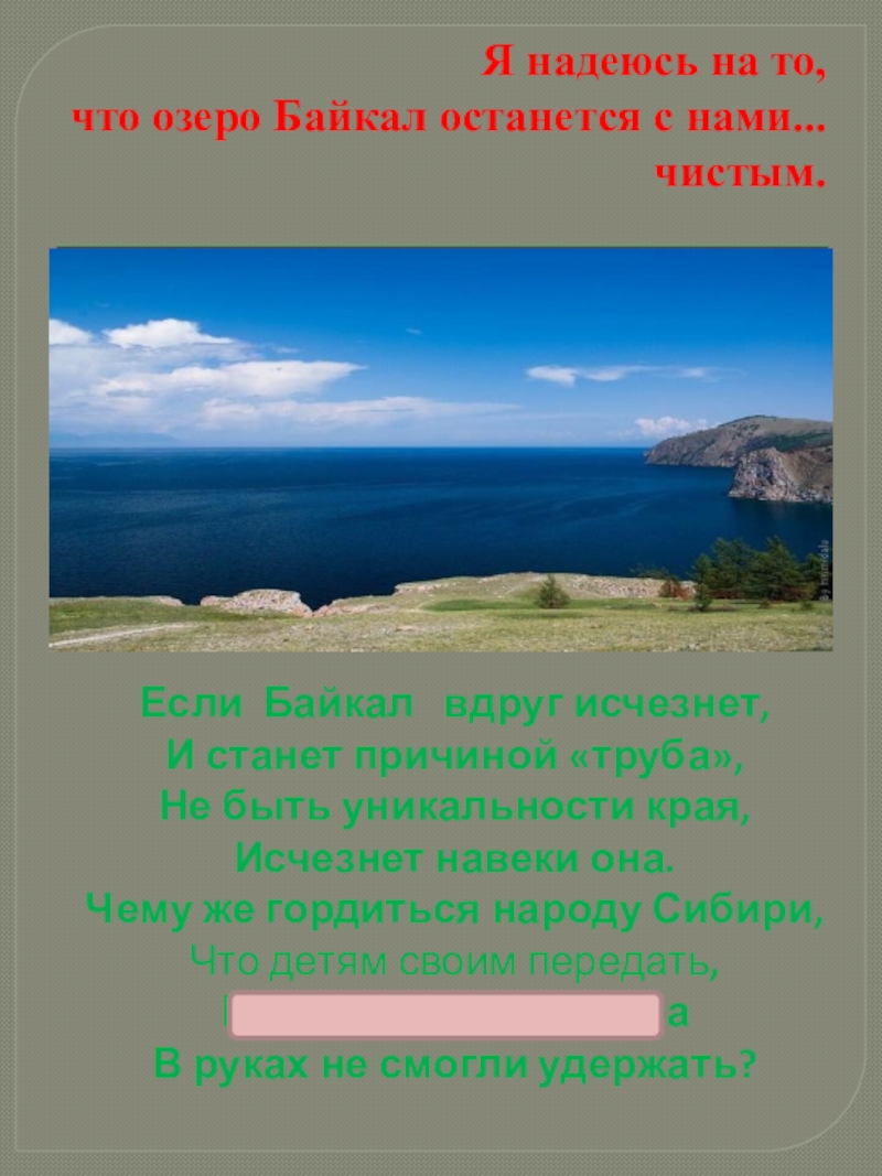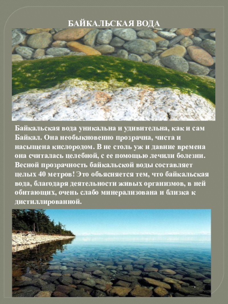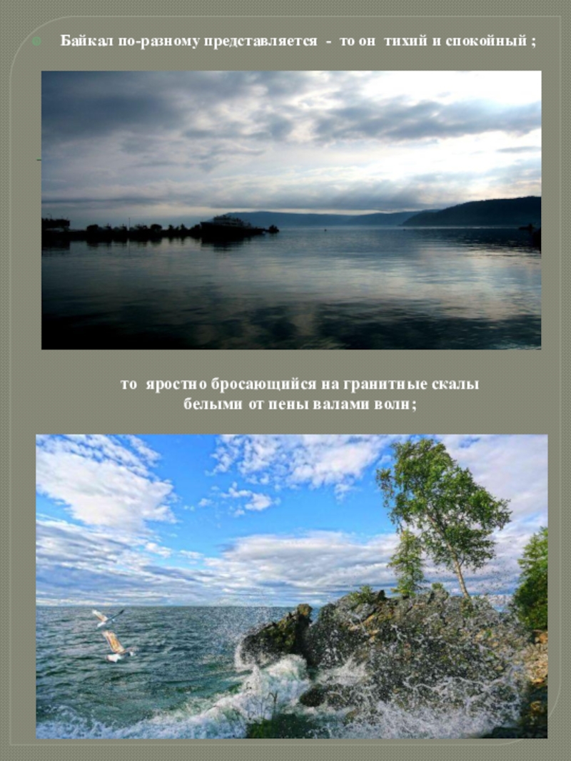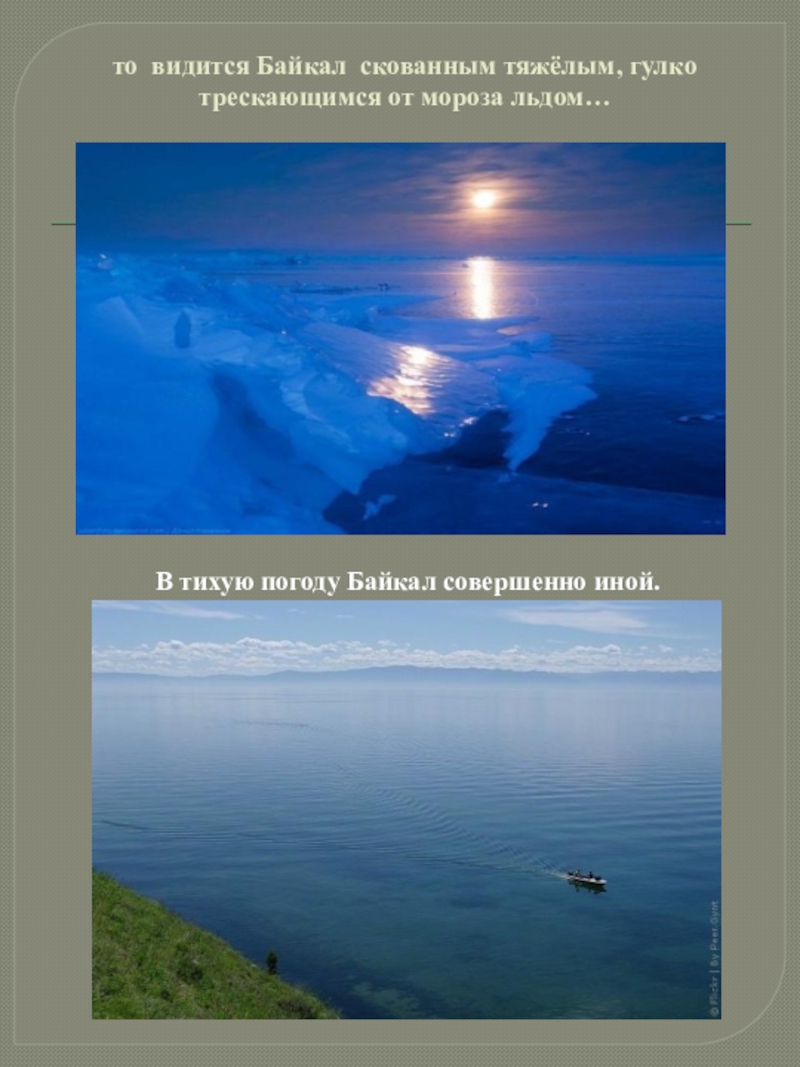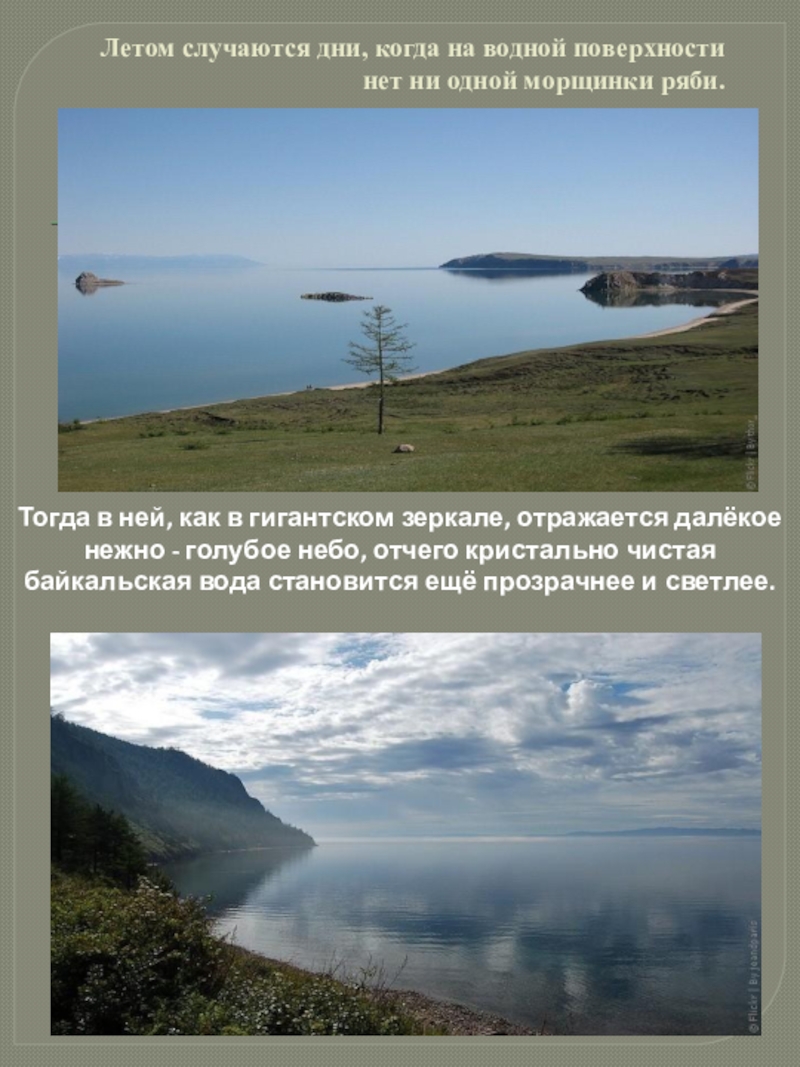 Тогда в ней, как в гигантском зеркале, отражается далёкое нежно - голубое небо, отчего кристально чистая байкальская вода становится ещё прозрачнее и светлее.