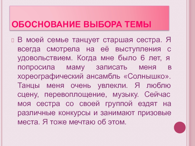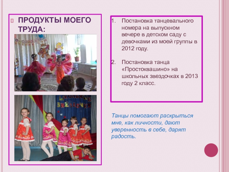 Танцы помогают раскрыться мне, как личности, дают уверенность в себе, дарят радость.