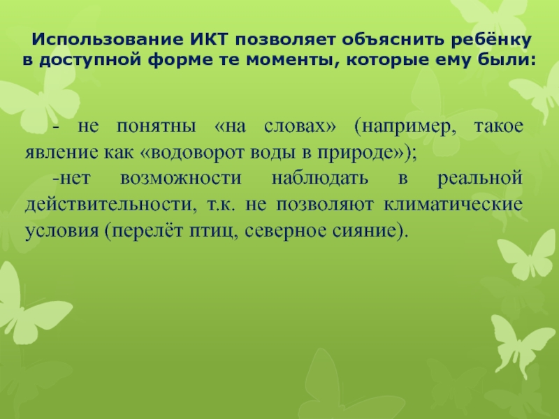 -нет возможности наблюдать в реальной действительности, т.к. не позволяют климатические условия (перелёт птиц, северное сияние).
