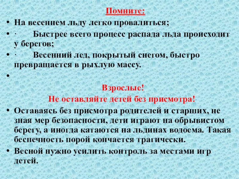 Помните:На весеннем льду легко провалиться;·       Быстрее всего процесс распада льда происходит у берегов;·       Весенний лед, покрытый снегом, быстро превращается