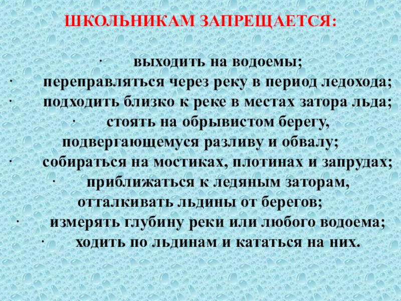 Слайд 4ШКОЛЬНИКАМ ЗАПРЕЩАЕТСЯ:   ·       выходить на водоемы; ·       переправляться через реку в период ледохода; ·       подходить близко к