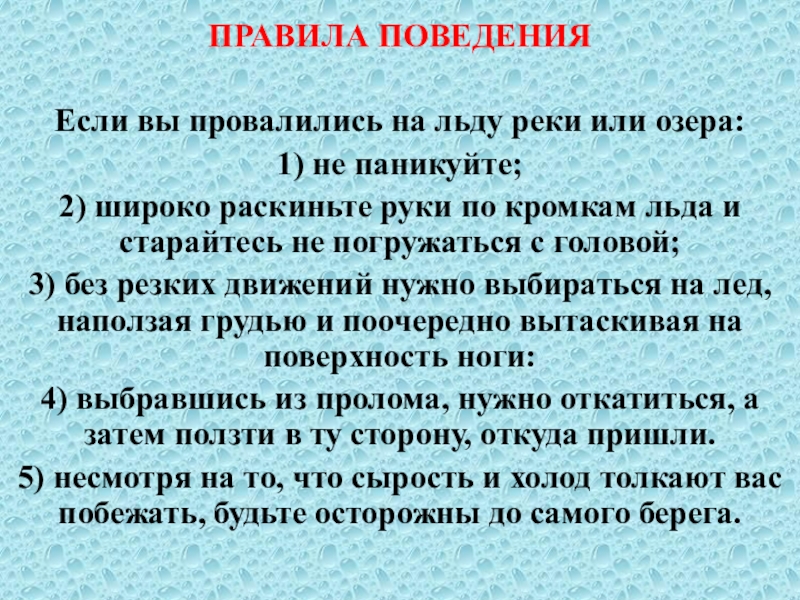 ПРАВИЛА ПОВЕДЕНИЯ  Если вы провалились на льду реки или озера: 1) не паникуйте;2) широко раскиньте руки по