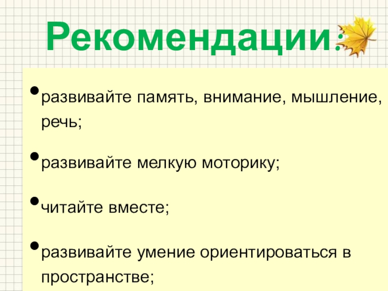Рекомендации:развивайте память, внимание, мышление, речь;развивайте мелкую моторику;читайте вместе;развивайте умение ориентироваться в пространстве;развивайте речь;учите говорить;приучайте к самообслуживанию;