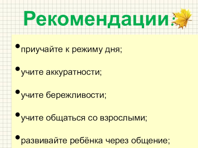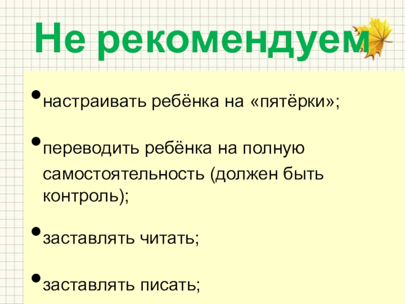 Не рекомендуемнастраивать ребёнка на «пятёрки»;переводить ребёнка на полную самостоятельность (должен быть контроль);заставлять читать;заставлять писать;сравнивать своего ребёнка с