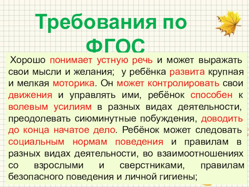 и желания; у ребёнка развита крупная и мелкая моторика. Он может контролировать свои движения и управлять ими, ребёнок способен к волевым усилиям в разных видах деятельности, преодолевать сиюминутные побуждения, доводить до конца начатое дело. Ребёнок может следовать социальным нормам поведения и правилам в разных видах деятельности, во взаимоотношениях со взрослыми и сверстниками, правилам безопасного поведения и личной гигиены;