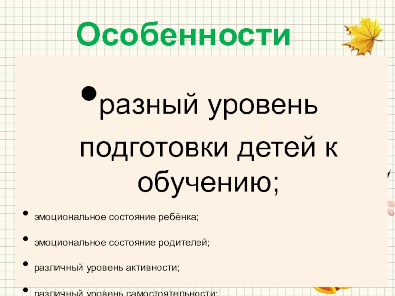 Особенностиразный уровень подготовки детей к обучению;эмоциональное состояние ребёнка;эмоциональное состояние родителей;различный уровень активности;различный уровень самостоятельности;не умение ориентироваться в