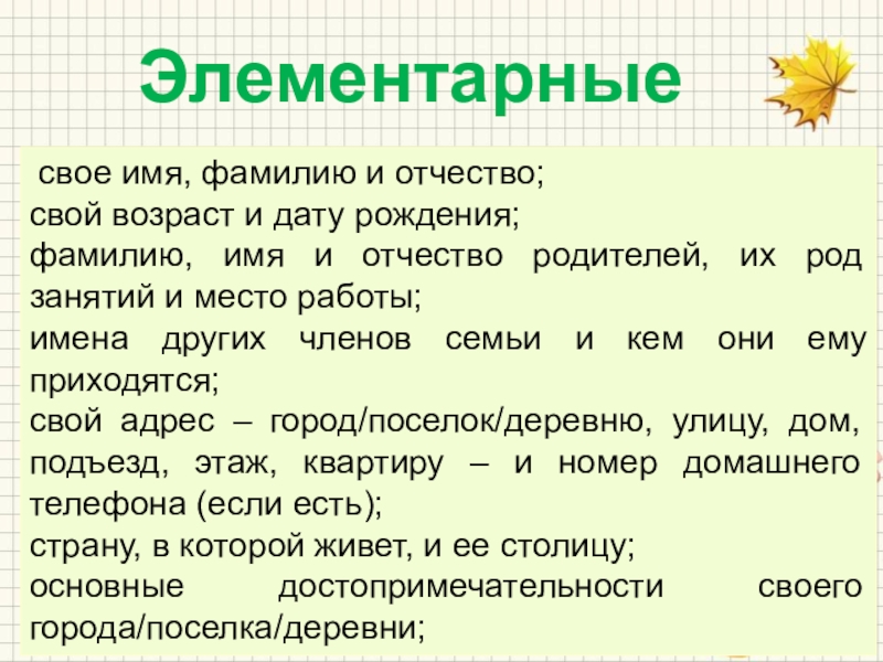 Элементарные знания свое имя, фамилию и отчество;свой возраст и дату рождения;фамилию, имя и отчество родителей, их род занятий