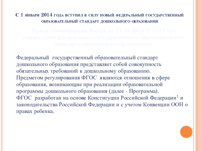 ФГОС разработан на основе Конституции Российской Федерации1 и законодательства Российской Федерации и с учетом Конвенции ООН о правах ребенка.