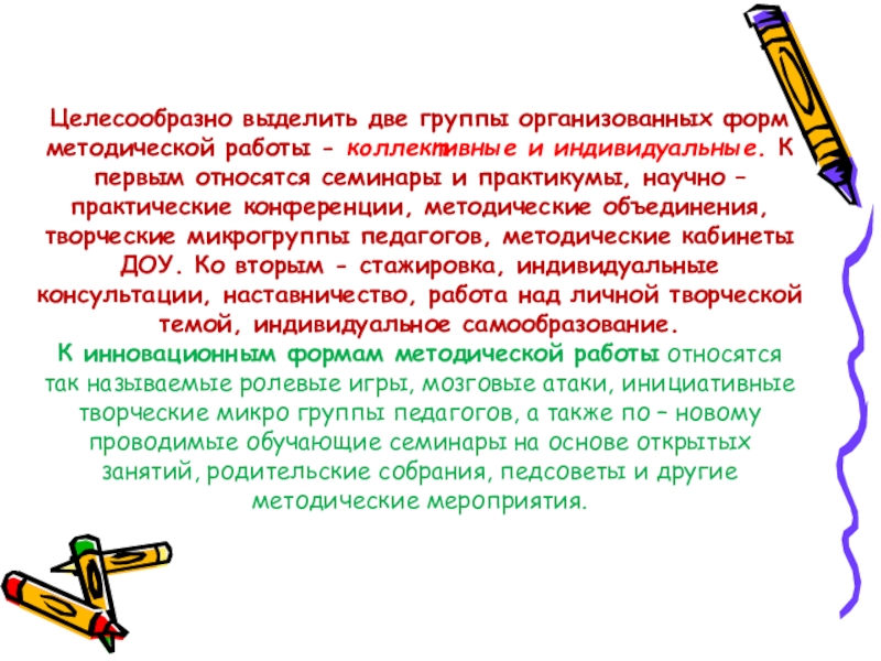 Слайд 14Целесообразно выделить две группы организованных форм методической работы - коллективные и