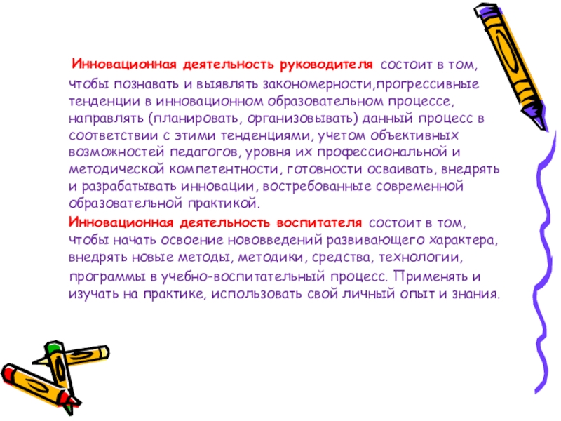 Слайд 15 Инновационная деятельность руководителя состоит в том,