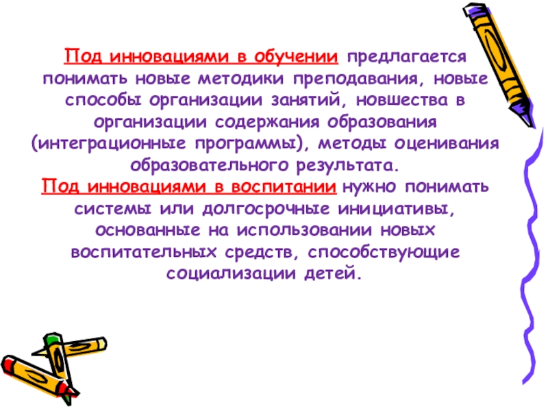 Под инновациями в воспитании нужно понимать системы или долгосрочные инициативы, основанные на использовании новых воспитательных средств, способствующие социализации детей.
