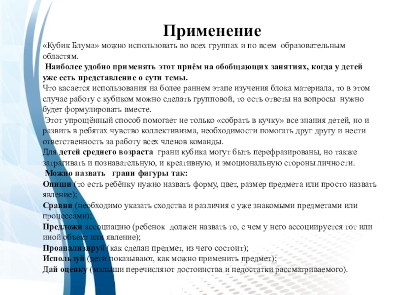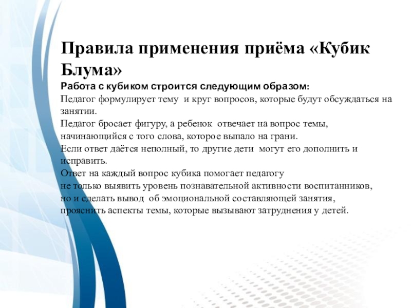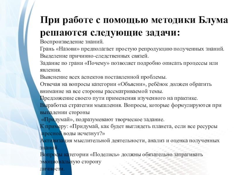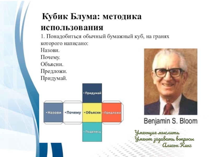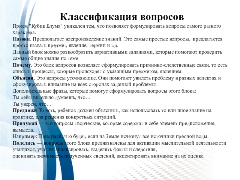 Прием "Кубик Блума" уникален тем, что позволяет формулировать вопросы самого