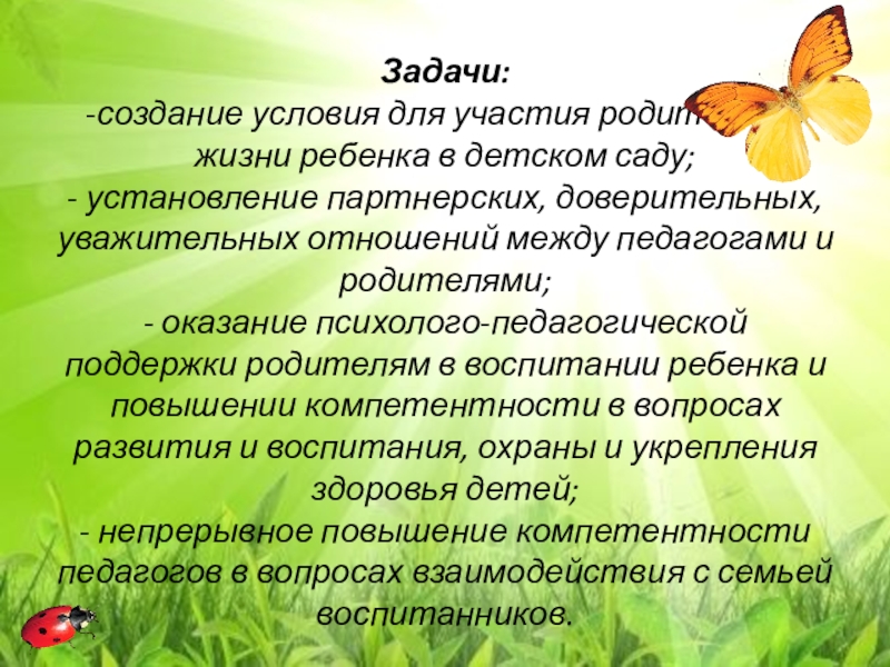 Задачи: -создание условия для участия родителей в жизни ребенка в детском саду; - установление партнерских, доверительных,